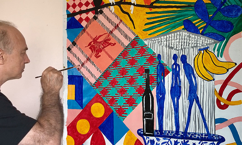 Figurative abstraction, combining art-historical figures and patterns from various cultures (Explore).