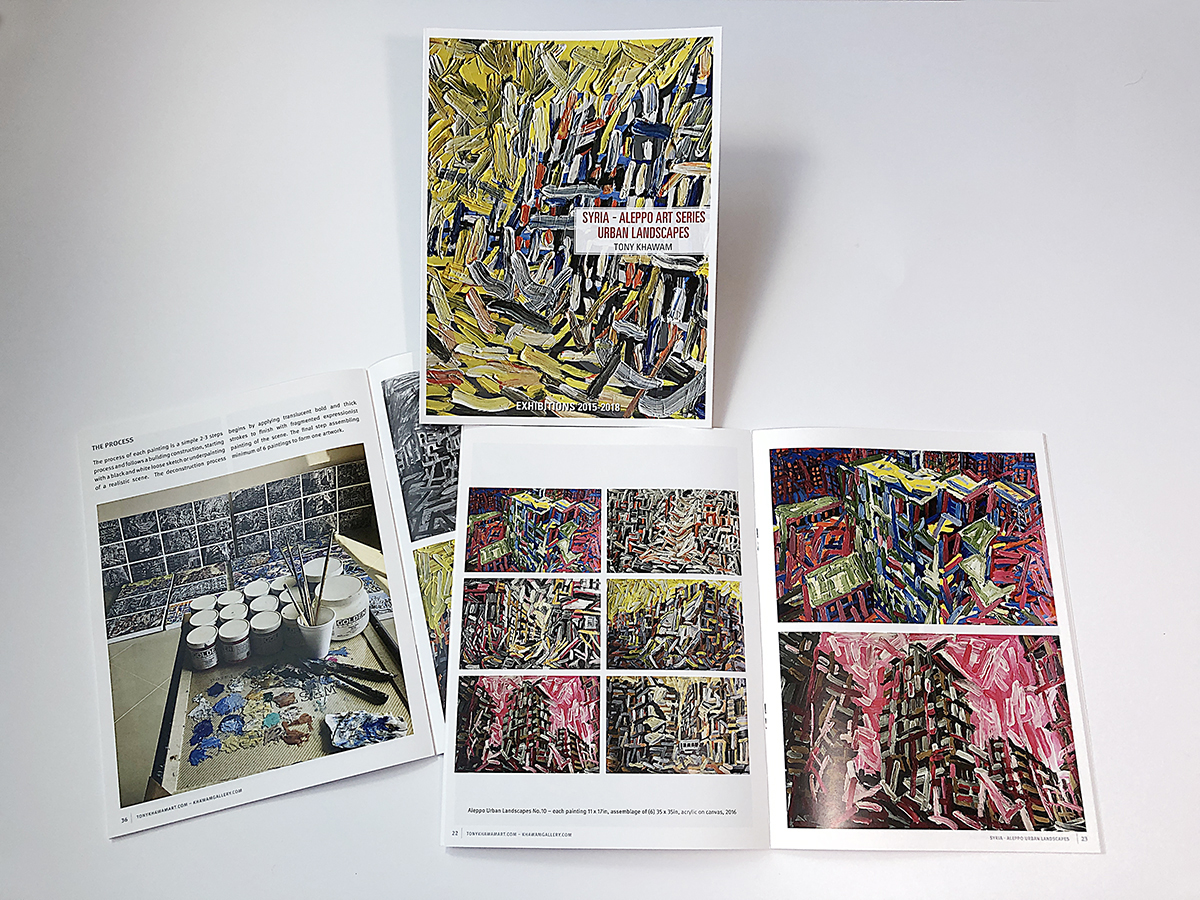 Art Catalog (Out of Stock): A 44-page gallery-quality catalog of the 2015-2018 Aleppo Urban Landscape series with scenes of collapsed apartment floors, fallen balconies, curved rooftops, debris, and punched holes in building facades. The painting series reveals haunting and disturbing scenes and is intentionally painted with a palette of joyful colors that emerge from the canvas with a vigorous life force.
