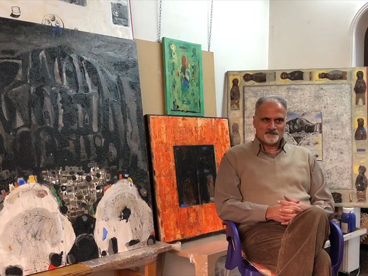 Nizar Sabour received his PhD in art philosophy from Strugunov Academy in Moscow and now lives and works in Damascus and Moscow. The influence of Syrian-Russian cultures are reflected in his work which splits between two themes, the first has religious undertones, focusing on the artist’s fascination with historical imagery and icons whether Christian, Islamic or non-Abrahamic traditions and the second theme is very poetic. His images tend to appear archaic, utilizing traditional elements silkscreened with paint, sand, and ash on canvas, with a flattened perspective and spots of colored shapes. The Icons, Maaloula and Palmyra have a correlation to the historical and religious places in Syria where the extremists entered towns and ransacked the culture. Work Samples