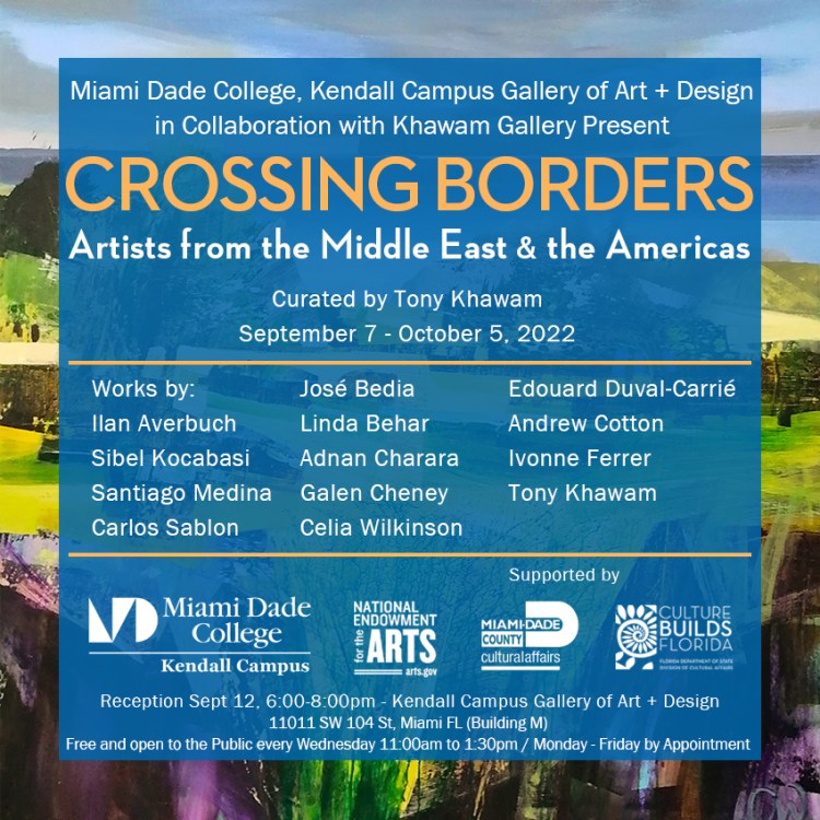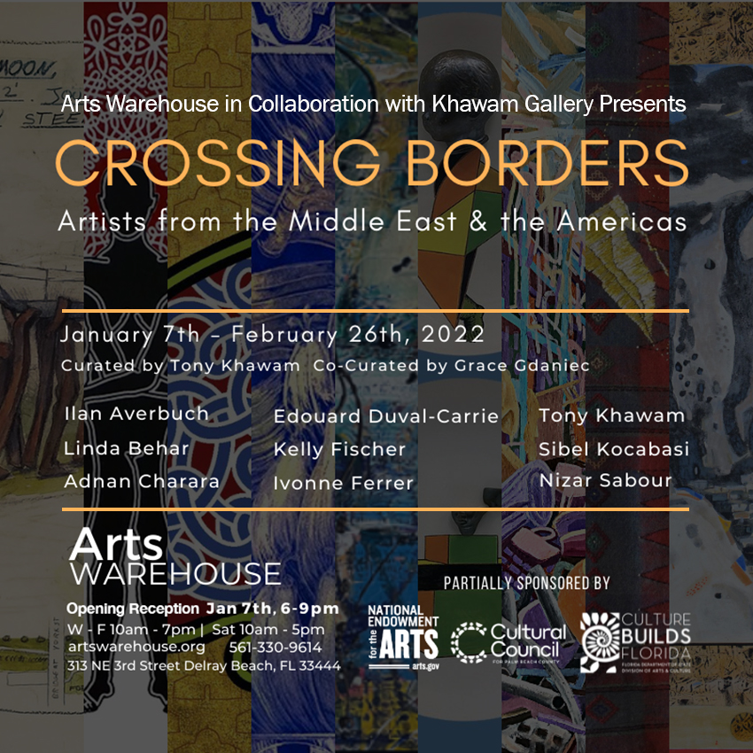 January 7 – February 26, 2022 – Exhibition and cultural events, In-person and virtual Zoom live streaming. A selection of works by Eight immigrant artists from the Middle East, Cuba, Haiti, Venezuela, and Switzerland. Works by Ilan Averbuch, Linda Behar, Edouard Duval-Carrié, Adnan Charara, Ivonne Ferrer, Tony Khawam, Sibel Kocabasi, Kelly Fischer, and Nizar Sabour.