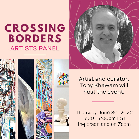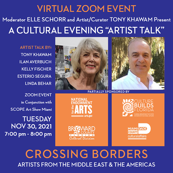 A Cultural Evening “Artist Panel” moderator Elle Schorr and a brief about the importance of Crossing Borders cultural arts project presented by Tony Khawam, followed by artist talk with Ilan Averbuch, Kelly Fischer, Esterio Segura, Linda Behar.