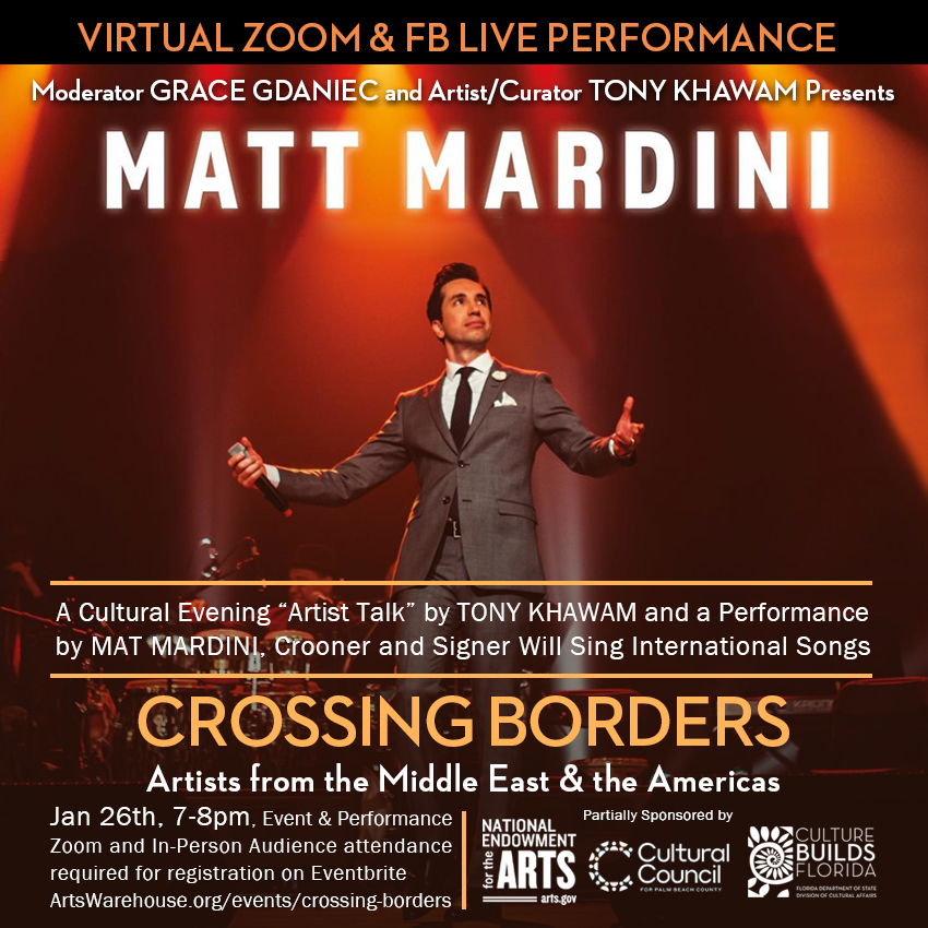 Immigrant artists from Turkey, Syria, Israel, Lebanon, Colombia, Cuba, Haiti, Venezuela, Russia, France, and the UK share their art and personal stories about their cultural heritage intertwined with their American experience, and the impact of immigration and the new American culture on their lives and art making. The project entitled “Crossing Borders: Artists from the Middle East & the Americas” an art exhibition with cultural events from South Florida’s rich multicultural community. At the exhibit opening, attendants will experience “A Taste of the Middle East, and Latin America,” and engage the attendants in a facilitated dialogue focusing on building cultural understanding, dispelling stereotypes, and fostering awareness of immigrants from the Middle East, the Americas and beyond with stories of their history in the U.S. This will be shared through videos, photos, and text as it contributes to the American fabric.