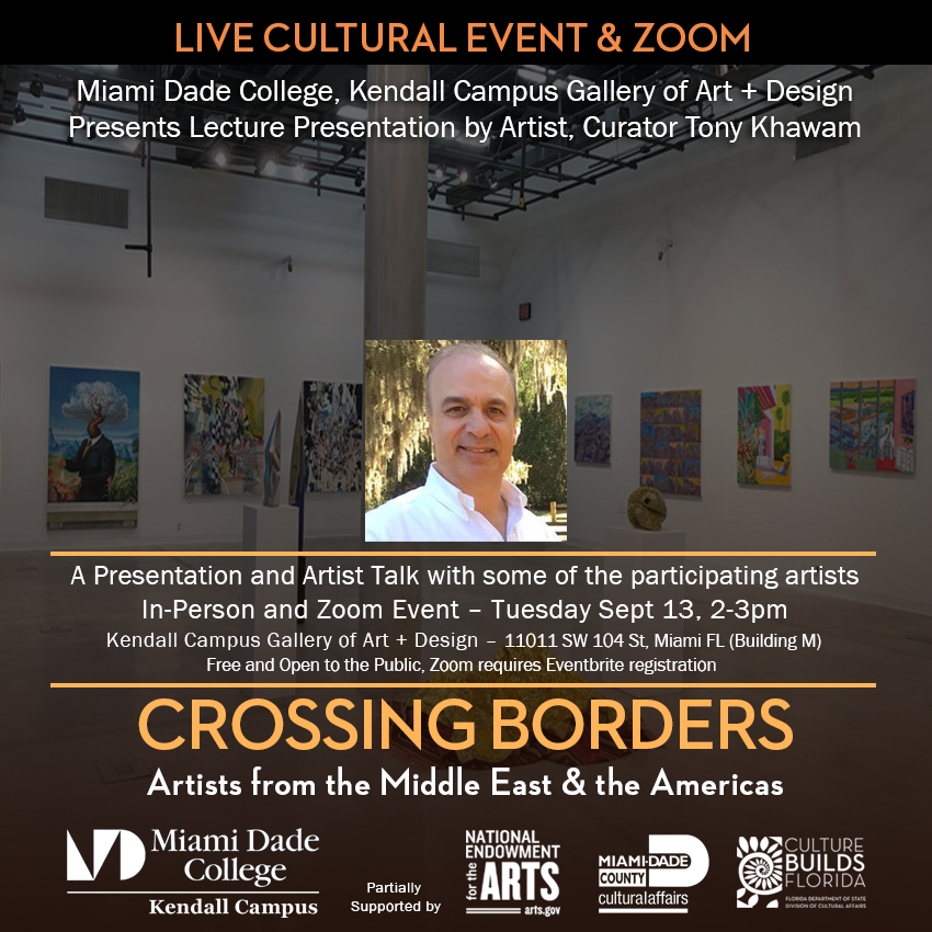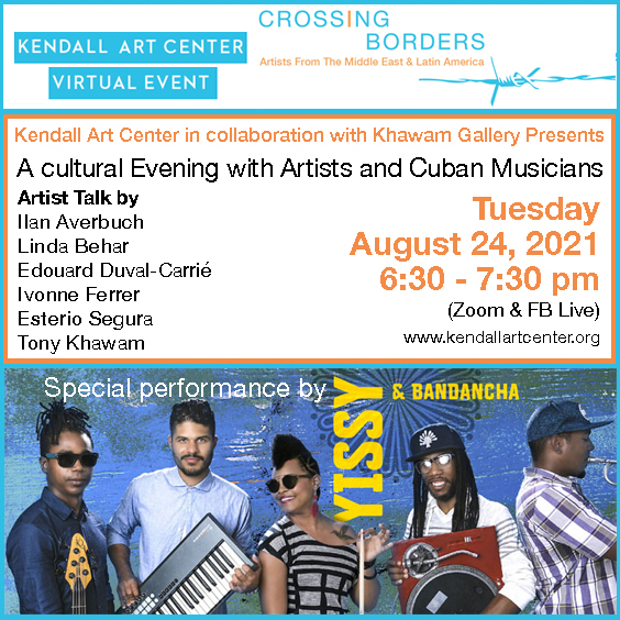 Exhibition and cultural events, In-person and virtual Zoom live streaming . A selection of works by immigrant artists from Colombia, Cuba, Haiti, Venezuela, Turkey, Israel, Syria, Russia, and the UK. works by Ilan Averbuch, José Bedia, Linda Behar, Edouard Duval-Carrié, Galen Cheney, Ivonne Ferrer, Tony Khawam, Sibel Kocabasi, Santiago Medina, and Nizar Sabour.