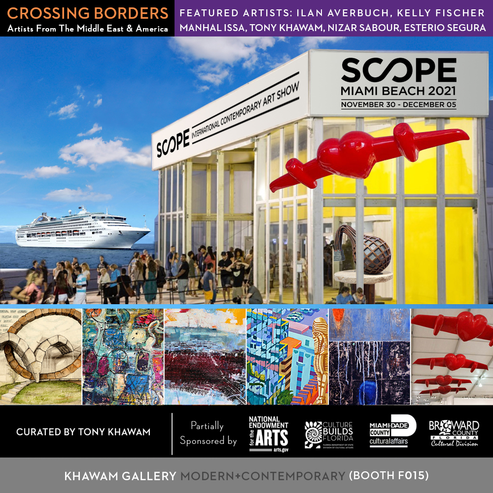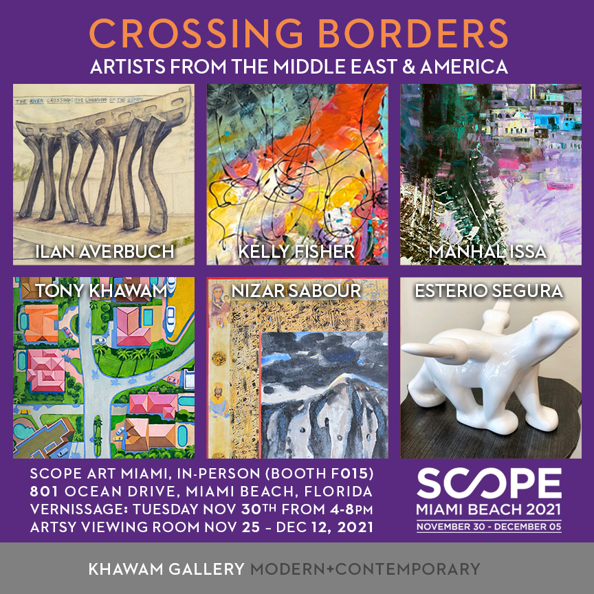 November 30 to December 5, 2021 – We are pleased to announce that Crossing Borders artists will participate in the SCOPE Art Show in-person during Art Miami week, Miami, FL. A selection of works by Six Middle Eastern, Swiss-American, and Cuban contemporary artists. Featured works by Ilan Averbuch, Kelly Fischer, Manhal Issa, Tony Khawam, Nizar Sabour, and Esterio Segura.